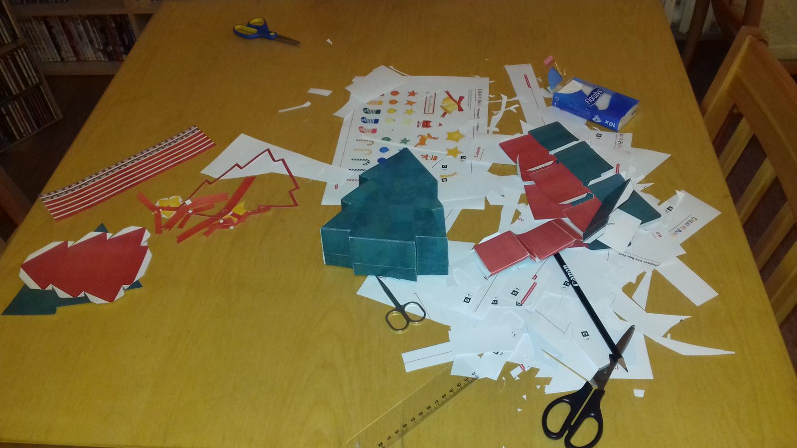 Tento den se mi stal osudný a V. byla u některých nehezkých projevů mého velkého nadšení z toho. Teddy roztomilý medvídek.Ta nejsložitější věc z celého mého (našeho) testování. Celý den jsem jen a pouze stříhala vším co jsem měla po ruce. Desítky, stovky, možná i tisíce malinkých trojůhelníčků mě trápily celý den. Teddy se skládá asi z 5O různých malých částí. Včechny tyto části mají malinké bílé trojúhelníky na následovné slepení. Prostříhat se tím vším mi trvalo vážně dlouho,ale já věci vždy dotáhnu dokonce, takže sem se nevzdávala. Aby toho nebylo málo, některé trojúhelníky se ohýbají nahoru, jiné dolu a další zase vůbec, k tomu,aby to člověk poznal jsou znázorněny bud tečky (ohyb dolu), tečky a čárky (ohyb nahoru) a celá čára znamená neohýbat. Rozložené jsem měla po celém jídelním stole,aby se mi nic neztratilo a měla v tom přehled. Celý tento svůj přehled jsem na stole nechala a kdybych mohla, dala bych si něco na posilnění na další den, den D:D