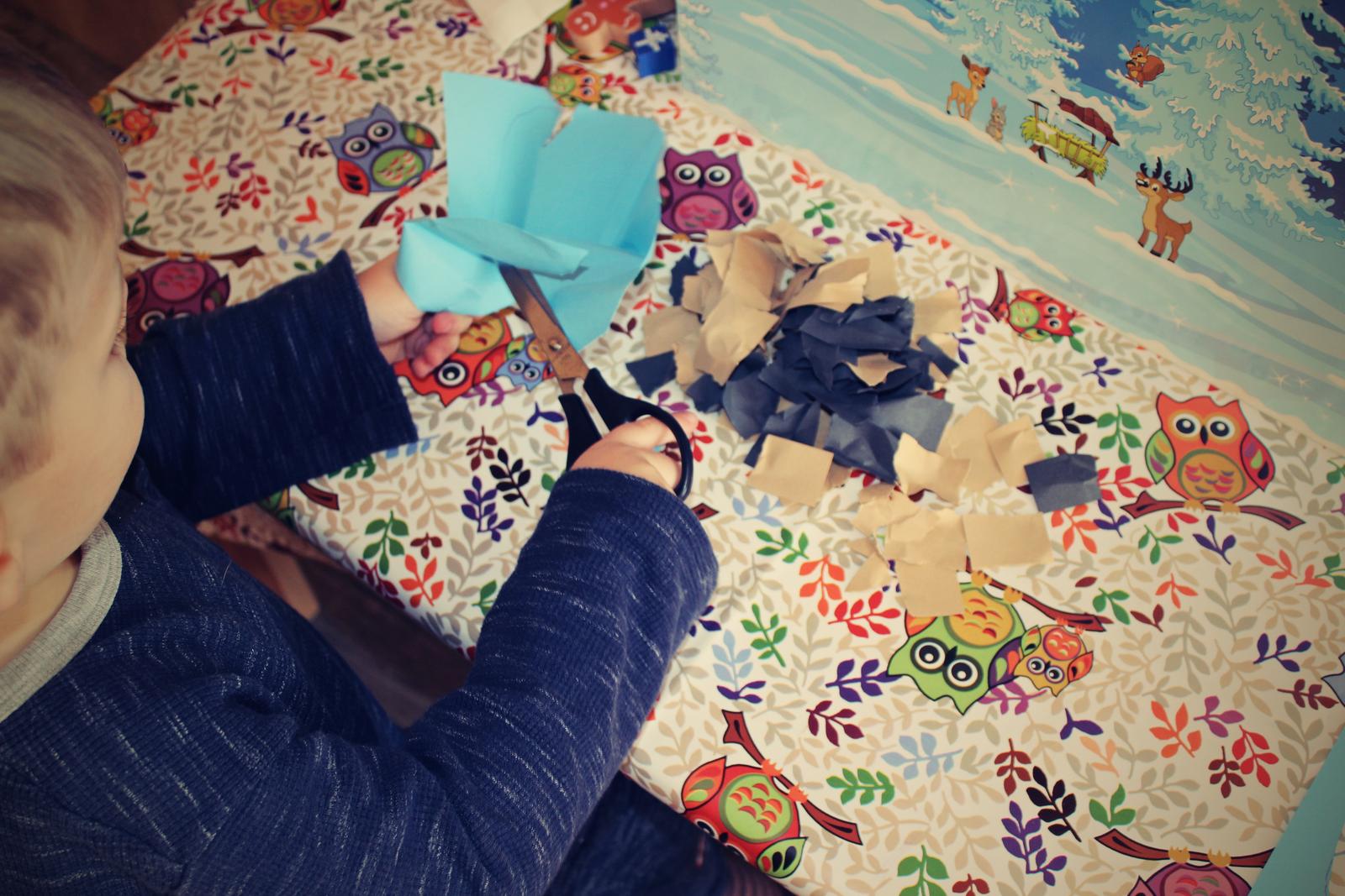 Dost mě ovšem překvapilo, jak jsou zvířátka drobná, nezabírala ani půlku papíru a i s nůžkami, které byly v sadě, by jejich vystříhání bylo sakra pracné a složité. Hned mi tedy bylo jasné, že je to spíš zábava pro mě než pro Tobíka. Děti sice vystřihování prvního zvířátka bedlivě pozorovaly, ale na další už mi nedaly prostor. Ani s lepením to nebylo o moc lepší. A tak jsem ze společného tvoření byli všichni akorát ulepení a obalení kousky papírků. Slona jsem alespoň zvládla vyfotit, ostatní zvířátka dožila dřív, než jsem se k tomu vůbec dostala.