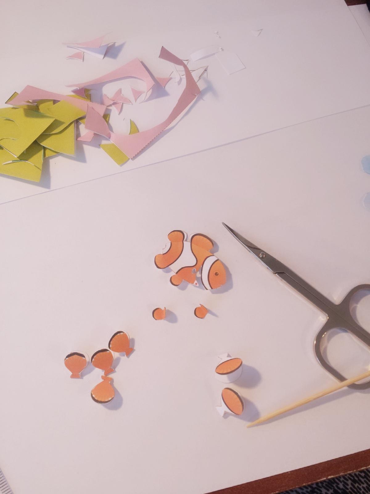 Jako první přisla na řadu rybka, ještě večer jsem na ní šla mrknout a hned mě to chytlo. Za mě byla asi nejjednodušší, ikdyž nejaké malinké části, se mi špatně lepily, protože dostat někudy dovnitř ruku, je občas nadlidský výkon. Chce to mít veliký cit v rukou, nebýt na vše hrr a za mě doporučuji používat místo tuhého lepidla tekuté. Já používala tekutého Herkulese a malý štětec. Když jsem lepila tuhým lepidlem, tak to moc nedrželo, musela jsem použít hodně síly v prstech,abych pořádně zmáčkla, aby se to nerozjíždělo, za to s Herkulesem se to pěkně nasáklo a nic mi nikam neujíždělo. Aspoň jsem připravena na další dny a můžu jít v klidu spát 🙂