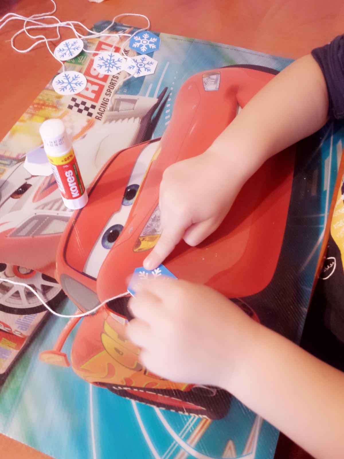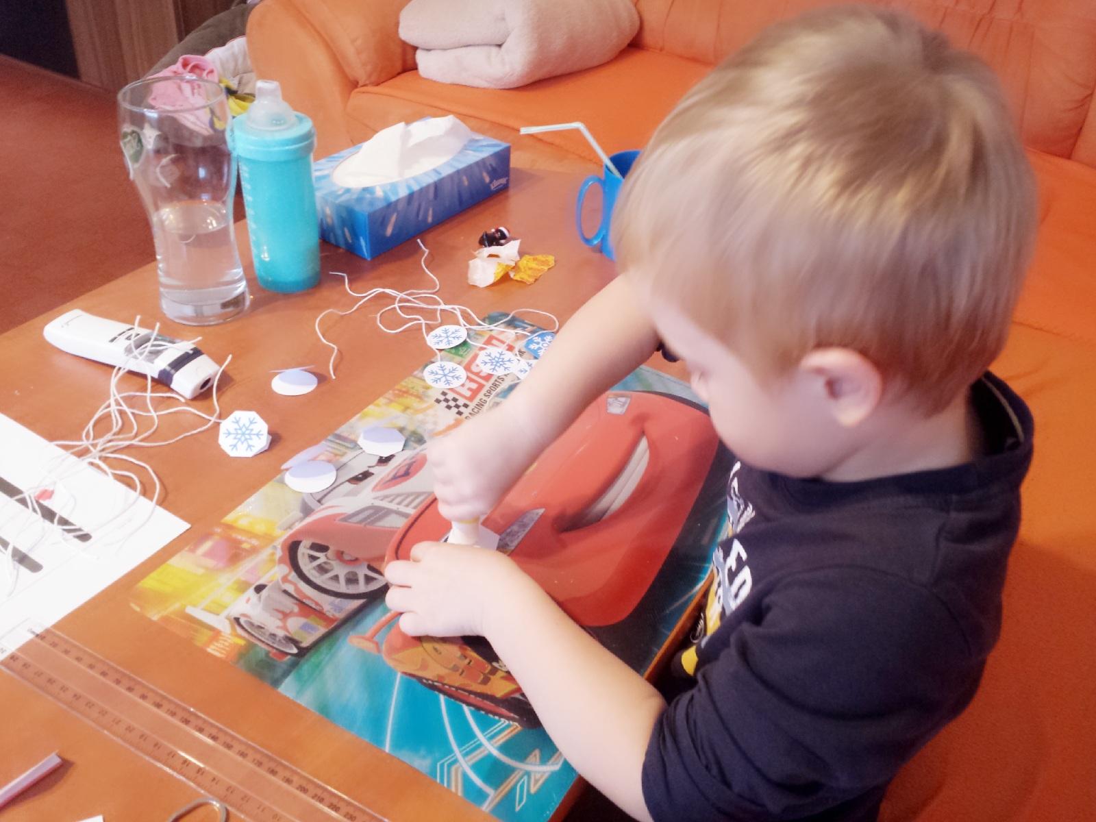 Matyášek moc zručný na stříhání není, ale patlat se s lepidle to mu jde moc dobře.
