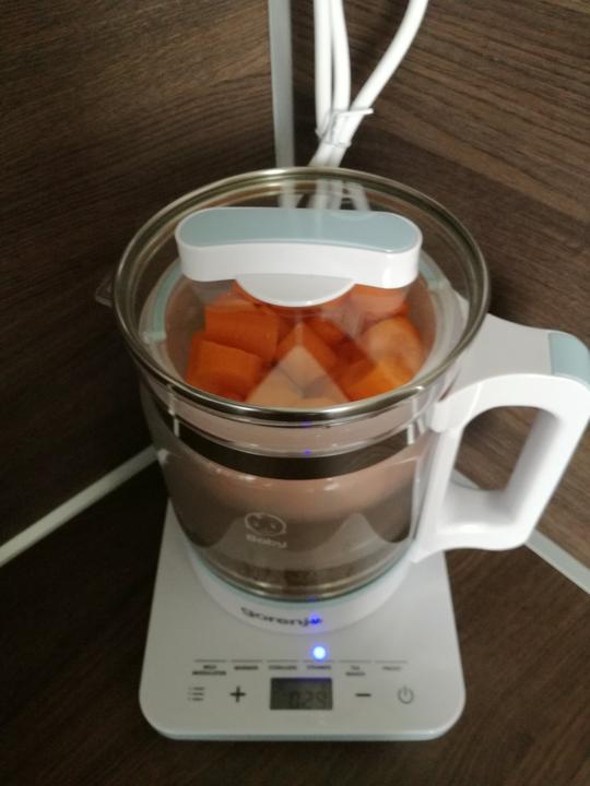 Jako první jsem v této konvici vyzkoušela vařit v páře je to opravdu velmi jednouduché. Po uplynutí nastaveného času konvice zapípá a sama se vypne. Dalším plusem je, že když dojde voda, tak konvice má v sobě pojistku proti spálení/zkratování výrobku (ale k této fázi jsem se nedostala). Jídlo si zachová svou chuť a vitamíny. Sebastiánkovi moc chutná. Proto této funkci nemám co vytknout.