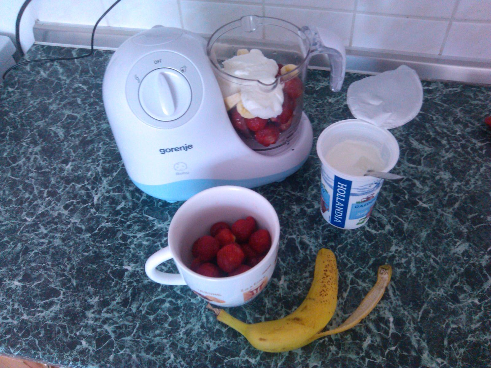 Zkusila jsem také domácí koktejl s ovoce, co nám aktuálně zraje na zahradě – jahody, maliny, jostu, plus jsem přidala domácí jablečné pyré a kousek banánu. Bohužel dcerka pro svoji nemoc nechtěla ani to, ale mě to moc chutnalo. Chystám se také na přípravu smoothie pro sebe. Objem mixovací nádoby je pro jednoho dospělého na jednu dávku úplně dostačující.