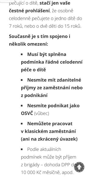 @katherine177 A z toho jasně plyne, že můžeš být osobou pečující a mít zároveň příjem a dokonce i podnikat, jediný rozdíl je v tom, že stát za tebe neplatí zdravotní pojištění, ale to je ti plně fuk, protože ho stejně z těchto příjmů vždy odvádíš a právě z titulu té péče o dítě nemusíš doplácet do minima, ale platíš jen ze skutečného výdělku.