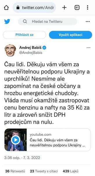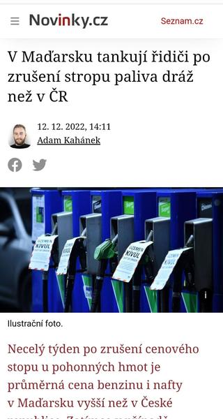 Začíná tweetem Andreje Babiše, kde vyzývá vládu abychom po vzoru Orbána v Maďarsku zastropovali ceny paliv, protože to je to nejlepší pro lidi. Na to mu vláda odpověděla, že to udělat nemůže, protože jakmile ten strop pustí, tak ceny vyletí.