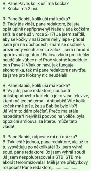 Já bych dokázala i pochopit, že AB nepochopí otázku, protože je Slovák (mám pár slovenských kolegyň a i když tu žijí roky, tak v některých případech musím otázku nebo nějaké vyjádření zopakovat jinak, protože to blbě pochopí) a neumí dobře česky. Ale pak by měl mít tolik sebereflexe, že prostě nebude kandidovat na reprezentativní funkci prezidenta ČR 😀