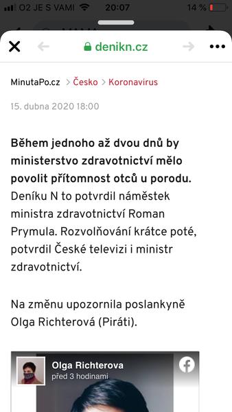 Info z ČT 24: Během jednoho až dvou dnů by měla být přítomnost otců u porodu povolena. Uvedla to místopředsedkyně Pirátů Olga Richterová s odvoláním na Romana Prymulu. Ten na to byl Richterovou dotázán na výboru pro zdravotnictví.