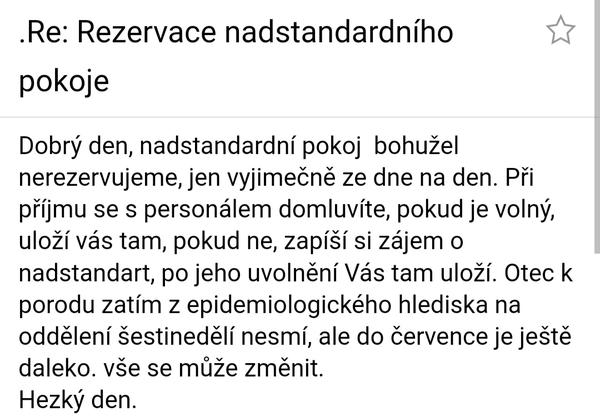 @danvitka proboha jen klid :D uplne zbytecny stres, ve vetsine pripadu je to o doktorech a situaci 🙂 treba ten email psala sestra, ktera o tom nic nevi a ridi se podle vseobecnych pravidel nemocnice 😀 jen netrap mimco v brisku 😉