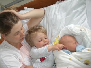 Tam mě napojila na minitor a konečně se tam nějaký kopečky ukázaly, ale stejně nic moc slavnýho. Ale bolelo to pekelně. PA prý že mi prdne vodu a pak že hned porodím, tak jestli chci, tak ještě můžeme chvíli počkat, jestli to manža stihne, že miminku se daří dobře. Tak jsme chvíli čekaly, ale pak už se to nedalo, tak mi prdla vodu a šla jsem tlačit, to teda bylo děsný, no, čtyři kila jsou 4 kila, že....... Ale nabídla mi několik poloh na tlačení a já nakonec rodila vleže na boku, jednu nohu zvedlou. Bylo to teda o moc lepší než s A., kdy jsem rodila klasicky vleže na zádech.