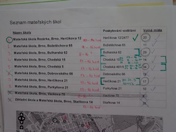 no pokud mate doma dite,kteremu budouteprve letos 3 roky,tak budete rady,ze ho vubec do nejake skolky dostanete...moje osobni zkusenost z lonska. Pres bodovy system...hruza. Brno je katastrofa. Pokud uz je starsi,tak uz mate realnou sanci dostat dite tam kam chcete. Loni 2014-volnych mist cca 2200 a hlasilo se pres 4000 deti.