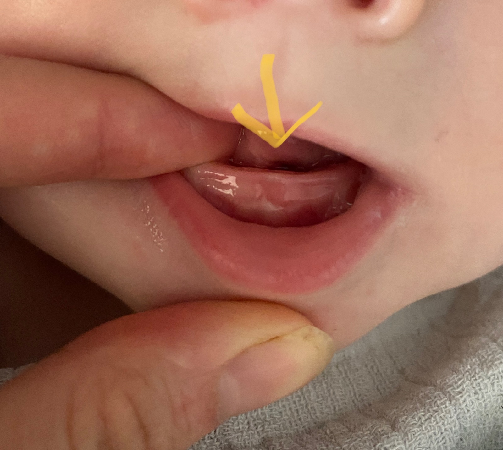 Ahojky holky, prosím o radu zkušenější - je ta bílá tečka, viz foto, první zoubek? Nejsem si jistá, jestli je takhle dole? Malej (6 měsíců) poslední měsíc hrozně protivnej, úplně ztratil zájem o příkrmy, začal odmítat i flašku, vezme si ji až po 3 minutovým cirkusu. Tak nevím jestli je to zubík nebo ne..