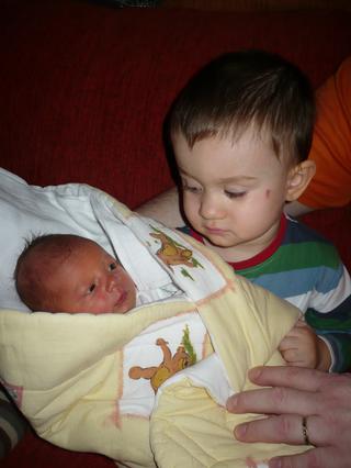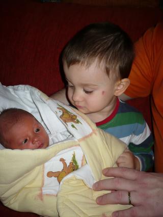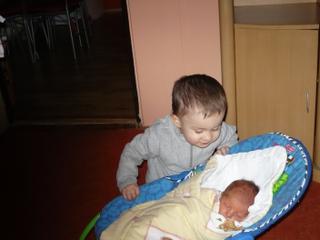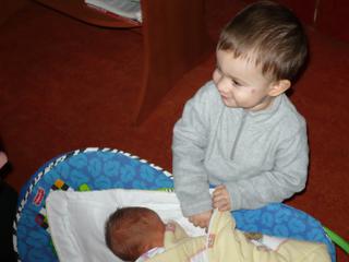 matýnek to taky celkem zvládá, vzdoruje tak nějak normálně, teda jako pořád stejně, ale kačku má rád, pusinkuje ji a chce ji chovat..dokonce se dožadoval kojení, ale to jsem mu rozmluvila...že má už zoubky 😎 😀 .