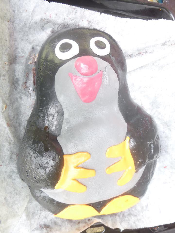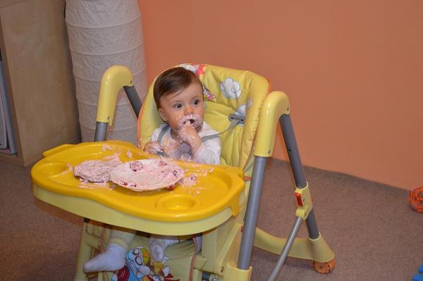 My jsme měli pojmutou oslavu prvních narozenin jako seznamovací pro naše rodiny. Dort jsem dělala obrovskej ve tvaru Krtečka co ho měl a má malej rád, dostal možná ochutnat jednu lžičku korpusu bez krému a zbytek se nabalil rodině (nějak jsme to s občerstvením přehnali). Nechtěla jsem aby se v něčem patlal, ne že by byl vyloženě vyfešákovanej když šlo o venkovní grilování ale nějak nevidím důvod proč by měl mít něco jako dort víc na sobě než v sobě. On teda v tý době ani nijak o patlání zájem nejevil..