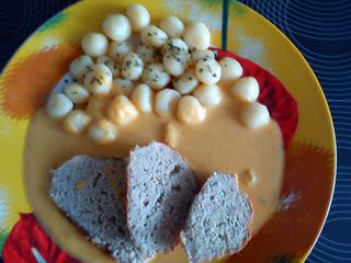 Dneska máme dýňový krém se zázvorem a bagetku, a plněné cukety s kuskusem a zeleninou zapečené se sýrem 😉 a cibulový koláč 😉