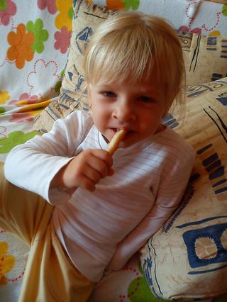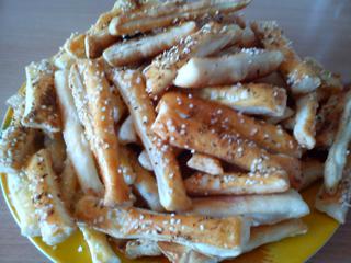 Těsto vyndáme na vál, vyválíme asi na 3mm silnou placku. Rozkrájíme na tyčinky, potřeme rozšlehaným bílkem, posypeme solí, kmínem, mákem nebo strouhaným sýrem. Záleží, jaké chceme kombinace.