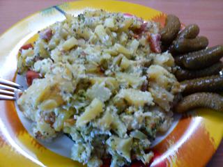 Orestujeme cibuli a česnek, přidáme na malé kostičky nakrájené brambory, 1 papriku červenou a asi 10 minut restujeme, až směs změkne, necháme vychladnout.