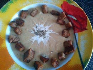 Pak polévku stáhneme, necháme trochu vychladnout, přelijeme do mixéru a rozmixujeme vše dohladka. Hrnec opláchneme, přelijeme do něj krém, přidáme šlehačku, podle chuti do polévky nastrouháme muškátový oříšek a polévku osolíme a opepříme. Za stálého míchání ji přivedeme k varu a můžeme podávat.