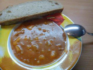 hovězí vývar a vidovický guláš ze sojového masa s rýží