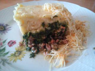 do misky zapékací jsme nejprve dala maso, na něj navrstvila špenát a pak zalila bramborovou kaší pekla cca 30 minutek, vytáhla a nechal trochu schladnou lépe se to krájí 😀