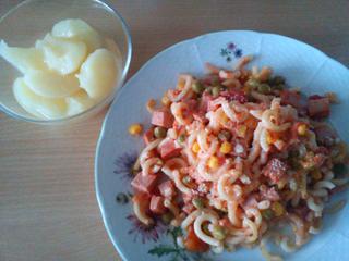 dnešní bašta 😀 zapečené nudle a krémová kuřecí polívka s nudličkami a hruštičkový kompotek 😀