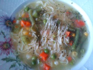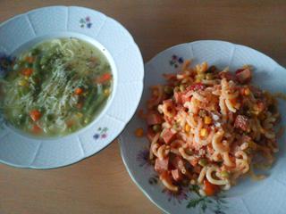 my dnes měli zel.vývar s celestýnskýma nudlema,žemlovku a teď už se tu dělá rajská omajda k večeři a na zítra