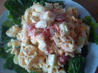 Sumiri tyčinky jen lehce smahnu na olivovém oleji , uvařené těstoviny nechám vychladnout a smíchám s drobně nakrájenou zeleninou a kukuřici z plechovky a vejci,v misce namíchám dresink z majolky a hořčice a zakysané smetany , pak vše pořádně promýchám , salát pokladu na natrhané listy římského salátu a posypu parmazánem