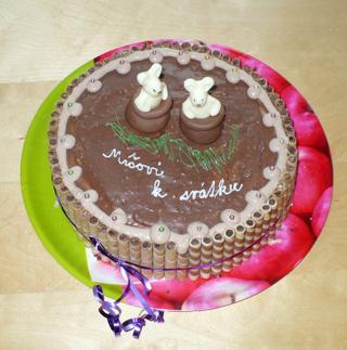 @lampion mohla bys vyzkoušet do toho dortu ten pribináčkový krém, pěkně drží, je fakt dost tuhý, po otevření formy dej nahoru talíř, převrať dnem vzhůru a to dno oddělej, jestli tam máš na spodu piškotyy, tak je budeš mít pěkně nahoře a bude to rovné - aby ti boky lépe držely, abys neměla strach, dej kolem cukrářské piškoty nebo plněné trubičky a svaž nějakou pěknou stuhou - nějak takhle - nahoře mám čokopolevu