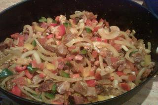 kulajda; hovězí plátky s nivou, žampiony pečené v alobalu (pokus, který se vydařil) s paprikovocibulovými bramborami (uvařím a po schládnutí opeču s cibulí a paprikou ve woku)