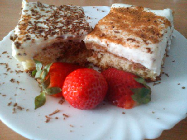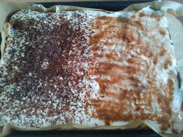 6) Na upečenou buchtu rozetřeme krém ze zakysané smetany a cukru