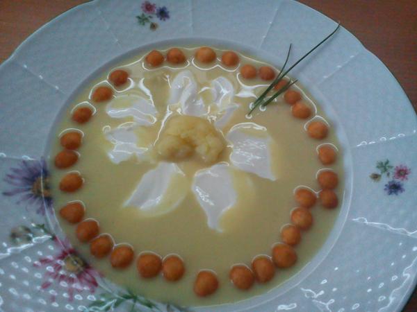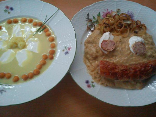dneska máme květákový krém s kukuřicí a kari, a zapékací klobásu s cizrnovou kaší.-)