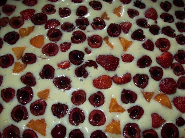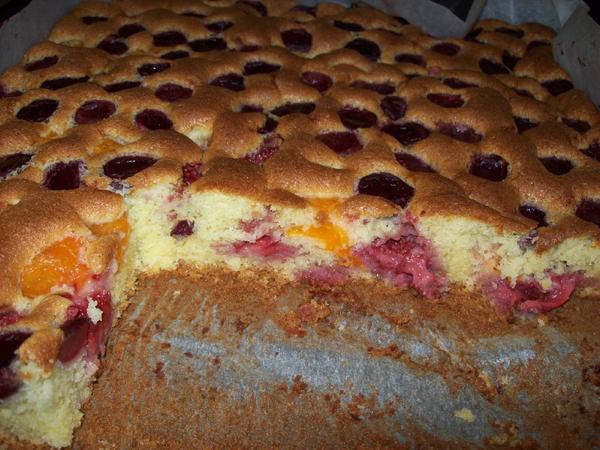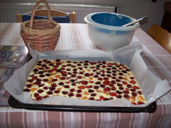 @lenam napřed sníh ze 4 bílků a špetky soli, pak 4 žloutky s hrnkem cukru a trochou mléka vyšlehat do pěny, přidávat na střídačku dva hrnky polohrubé mouky se dvěma lžičkama prášku do pečiva a hrnkem oleje 3/4 a mléka 1/4, když to prošleháš, tak vařečkou nebo stěrkou vmíchat ten tuhý sníh..vylít na hluboký plech vyložený peč.papírem a poklást ovocem.. já dala vypeckované třešně, jahody a meruňky..péct, dokud to nemá barvičku a špejle není suchá..