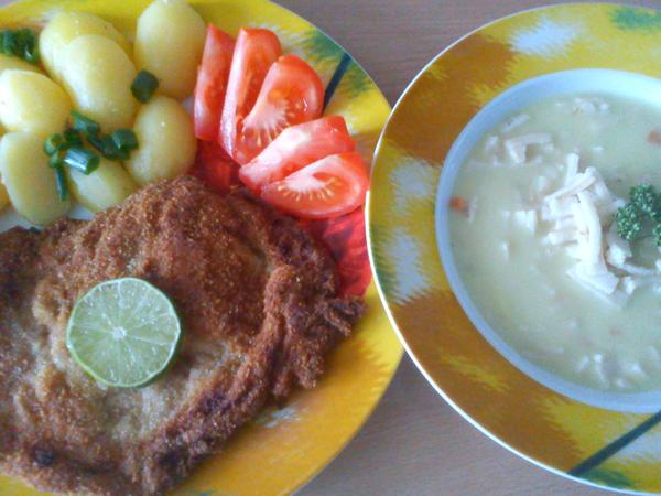 Dobrou chuť u nás kukuřicový krém s celestýnskými nudlemi a telecí řzek s novým bramborem🙂