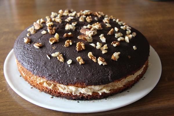 Tak jsem pekla a výsledkem je.....pudinková buchta se skořicovou šlehačkou, meruňkami a čokoládovou polevou s vlašskými ořechy