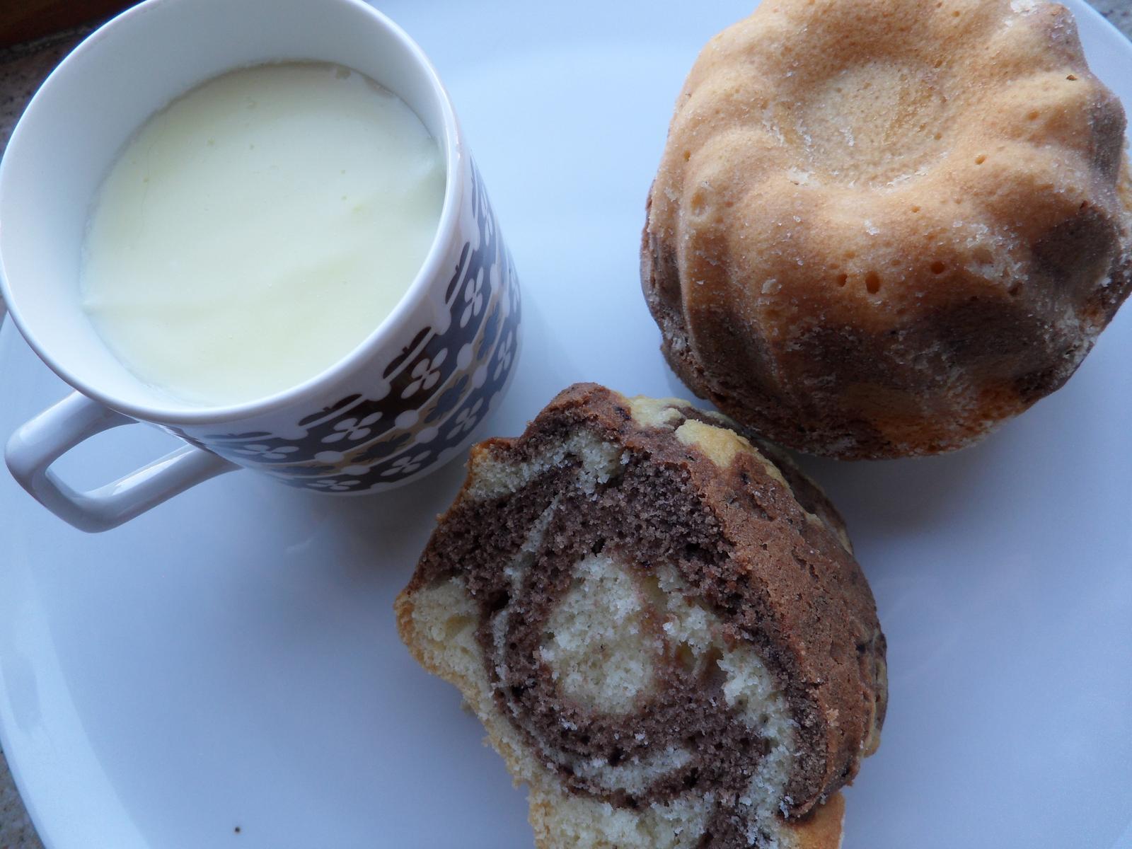 dnes jdeme na návštěvu, tak neseme bábovičky jako výslužku a tohle bylo k snídani: bábovička s pudinkem