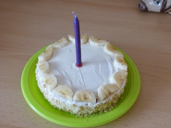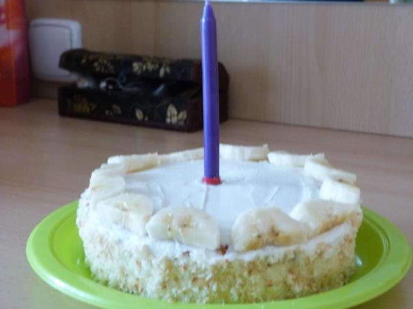 tenhle je jen z piškotového plátu. První vrstva piškotový plát, pak potřené trochou tvarohu s minimem cukru na to banány na kolečka, zase potřené tvarohem a piškotový plát. Potom jsem to celé potřela zbytkem tvarohu a ozdobyla piškotovýma drobkama, nahoře s banánem. Není to vůbec velký - ze 2 vajíček na 1plech - z toho jsem vykrojila 2kola. 😀 😀