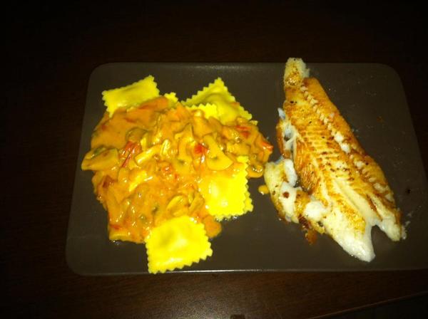 pečený halibut, těstoviny plněné dýní a kari omačka s kapii a žampiony