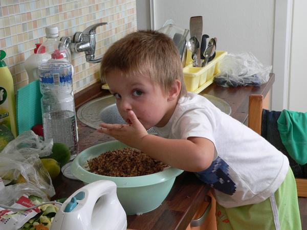 Dnes u nás platí bordel v bytě - šťastné dítě, dělali jsme knedlíčky do polívky a Matěj mi strouhal suché rohlíky na strouhanku. Mám pocit, že víc strouhanky je na lince a na podlaze než v knedlíčkách. Ale Matěj byl nadšený, že může pracovat. 😀