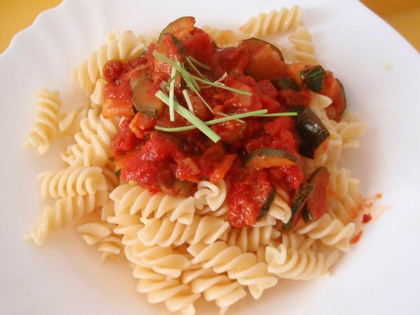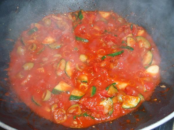 omáčka na těstoviny - drcena rajčata, olivy, oregano, cuketa