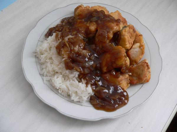 @michaelka83 Cibulku podusti na kostičky na oleji, přidat na plátky česnek a na nudličky zázvor. Zakápnout octem, přidat sójovou omáčku a vývar. Dosladit cukrem a přidat dezertní víno. Nakonec zahustit solamylem rozmíchaným v troše studené vody. Maso nakrájet na kostky a obalit v těstíčku z vajíčka a solamylu s trochou soli a osmažit na oleji.