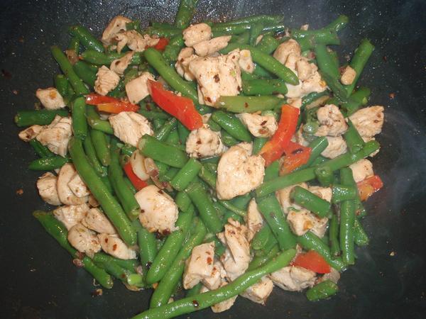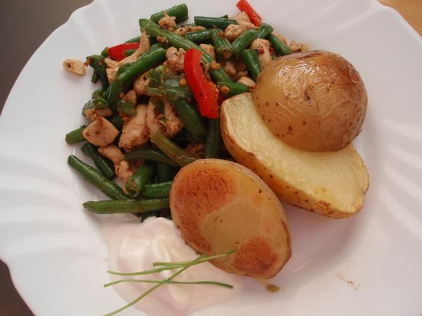 Kuřecí kousky restované s fazolkami a paprikou, pečený brambor