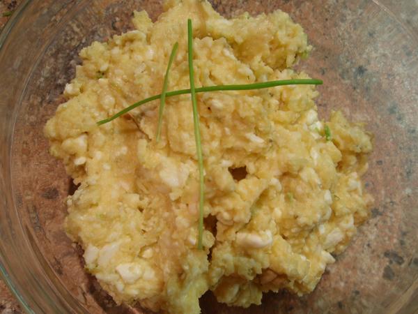 ČT nádivka z kuřecích jater, brambůrky s máslem, tzatziky