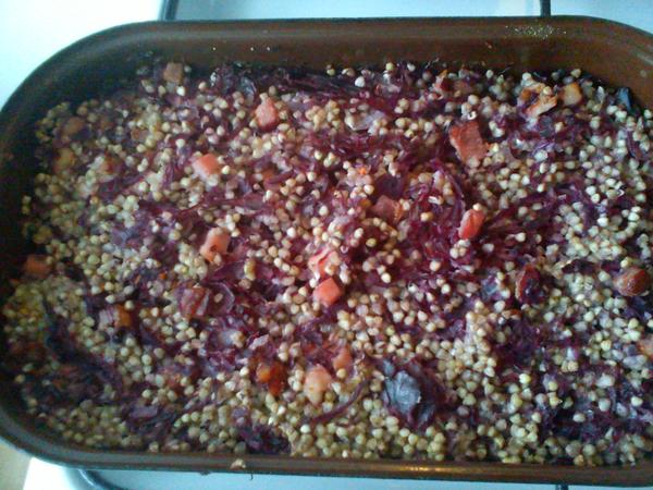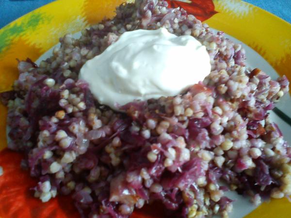 dnešní rychlo obídek hold noční je noční🙂 😀 zapečené pohankové kroupy s uzeným a červeným zelím a dresnk ze zakysané smetany 😀