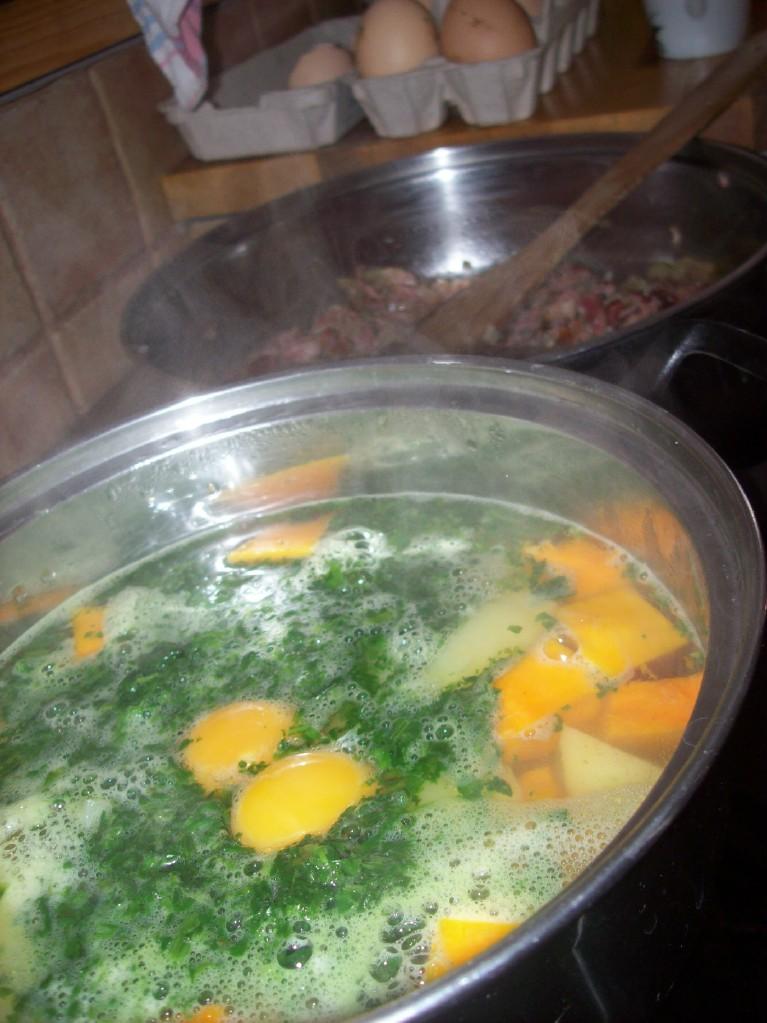 dneska zelňačka s klobásou, na zítřek nakonec nechystám kuře, nebyla jsem nakoupit.. vyndám kachní prsa..a upekla jsem dvojctihodné koláčky.. Tondovi králíka s dýní, bramborem a kouskem řapíkatýho ceeru, včera jsem dělala 4 porce žloutku s bramborem, dýní a špenátem, ochucené kouskem cibule..