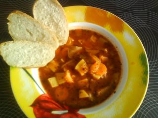 Nadrobno nasekanou cibulku spěníme na másle a přidáme cukr a rajský protlak a papriku chvilku osmahnem a přisipeme mouku a řádně zamícháme. Zalijeme vlažným vývarem nejdřív jen polovinou pořádně rozmícháme a dolijeme zbytek. Poté přidáme veškerou zeleninu, a vaříme do změknutí, akonec přidáme česnek a majoránku , dochutíme solí pepřem. podávám s bílým pečivem 😉