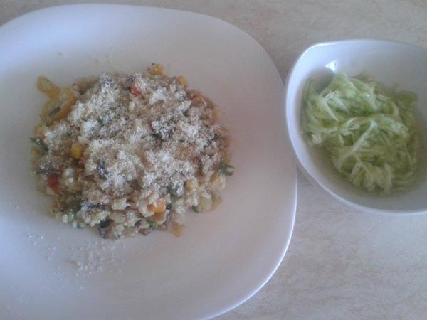rizoto na 2 porce: 100 g syrové rýže,150 g žampionů,1 cibule,200 g mražené zeleniny,sůl,pepř, zeleninový bujon bez soli,40 g sýra 30%