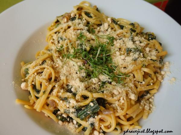 dneska oběd čínské nudle se špenátem a medvědím česnekem - vegan; večeře hrachová kaše se zkaramelizovanou cibulkou, krutony - vegan 🙂
