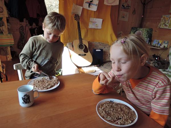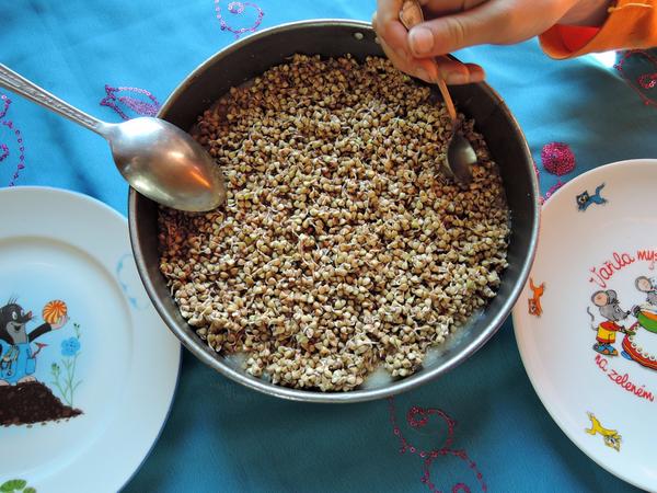 Vykouzlila jsem s dětmi rychlo sváteční snídani v podobě dortíku, po kterém ráno zatoužily. Ze zbytku rýže z večeře a naklíčené pohanky. Jednoduše bez marcipánových kanýrů 🙂