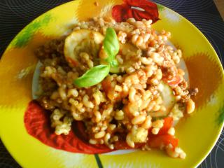 Zatím rozmixujeme česnek, polovinu rajčat a ocet na hladkou kaši. Na hluboké pánvi rozehřejeme olej, přidáme cukety a zbývající petrželku a opékáme je 3 minuty. Přidáme šalotky a krátce opečeme, potom přidáme rajčatovou směs a povaříme ji 10 minut do zhoustnutí.