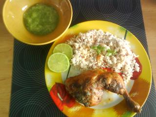kuřecí stehna pečená na zelenince a rýže, polévka drožďová ze včera 🙂