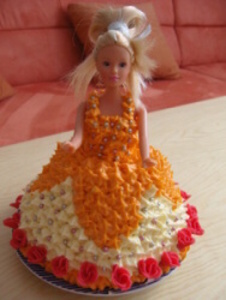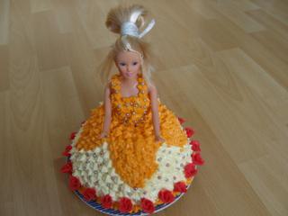 jako princezna je barbie na fotečce výš-a obměnou je změna barvičky krému a co vím,aby se nehnula tak je dobré ji něčím obložit(ovoce,kousek korpusu apod.),přece jen jak krém povolí může se stočit na jednu stranu
