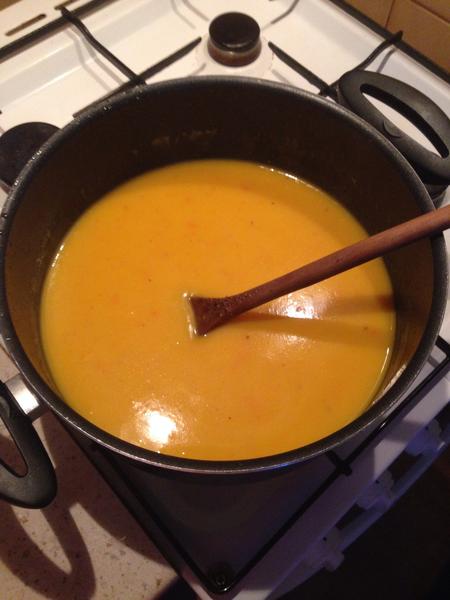 Pak dáte do hrnce trochu másla, přidáte dýni a brambory, necháte to chvilku osmahnout, zalejete vodou. Necháte to vařit než to všechno změkně. Pak to jen rozmixujete a dosolíte, případě dopepříte.